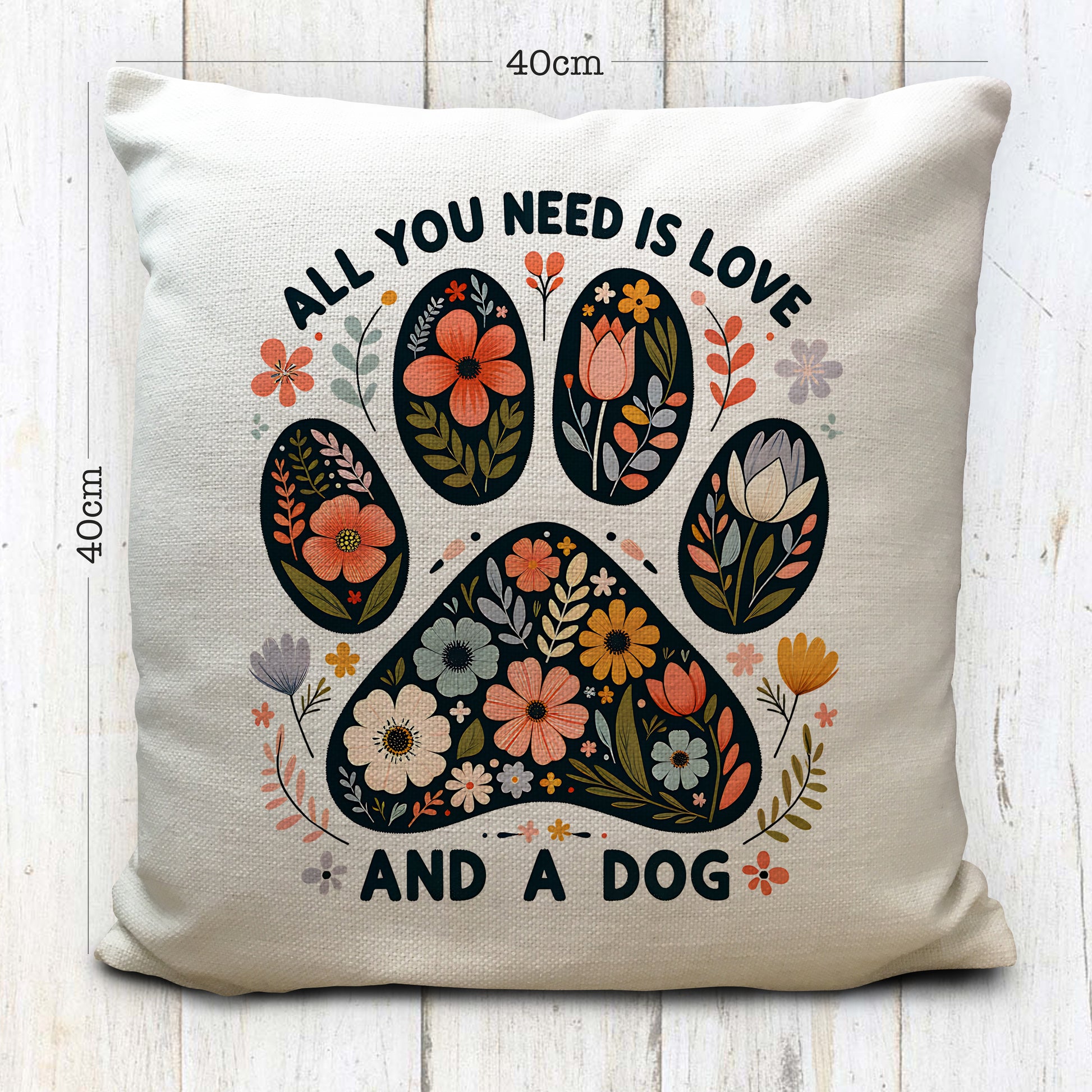 This is a Beautifully hand made pillow cushion cover featuring our colourful floral style Pawprint 'All you need is love and a dog" slogan.