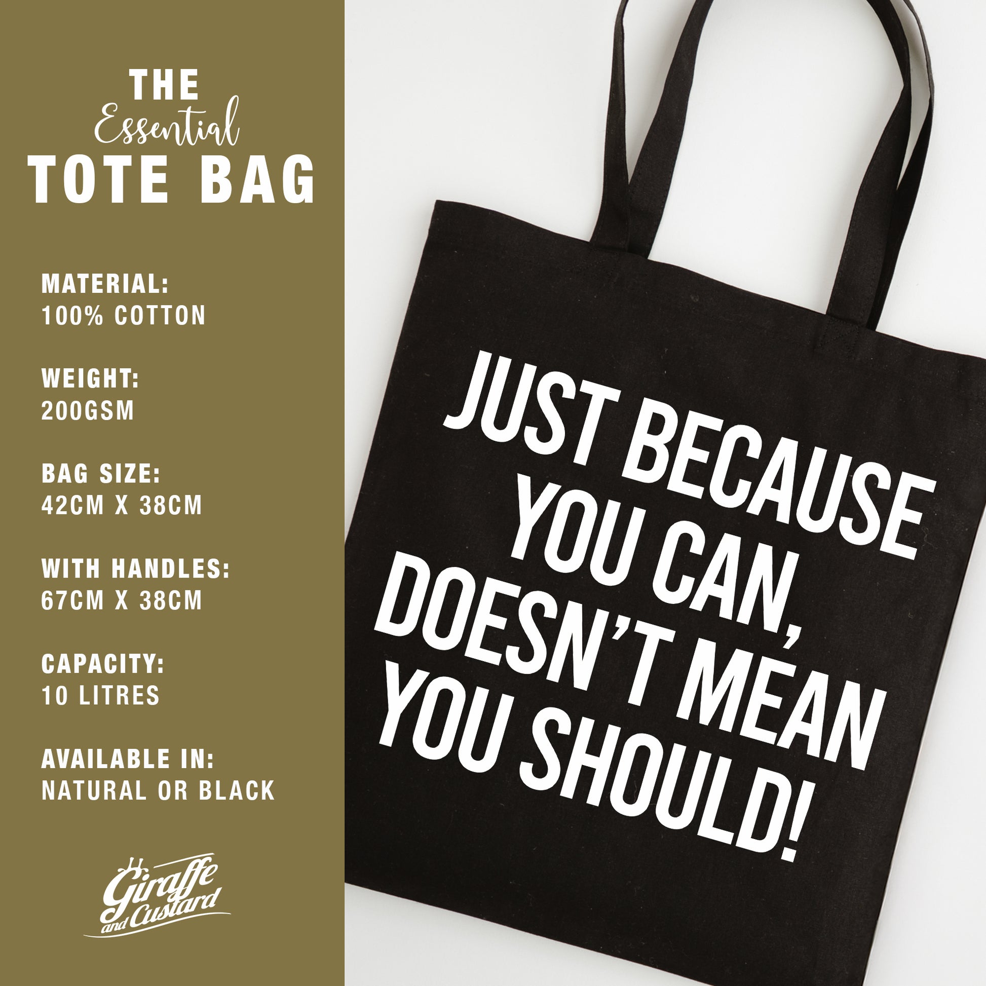 Make shopping more entertaining with this funny slogan tote bag featuring the quote “Just Because You Can, Doesn't Mean You Should!” Designed for shoppers with a sense of humour, this reusable tote is perfect for grocery runs, market trips, or casual everyday use.