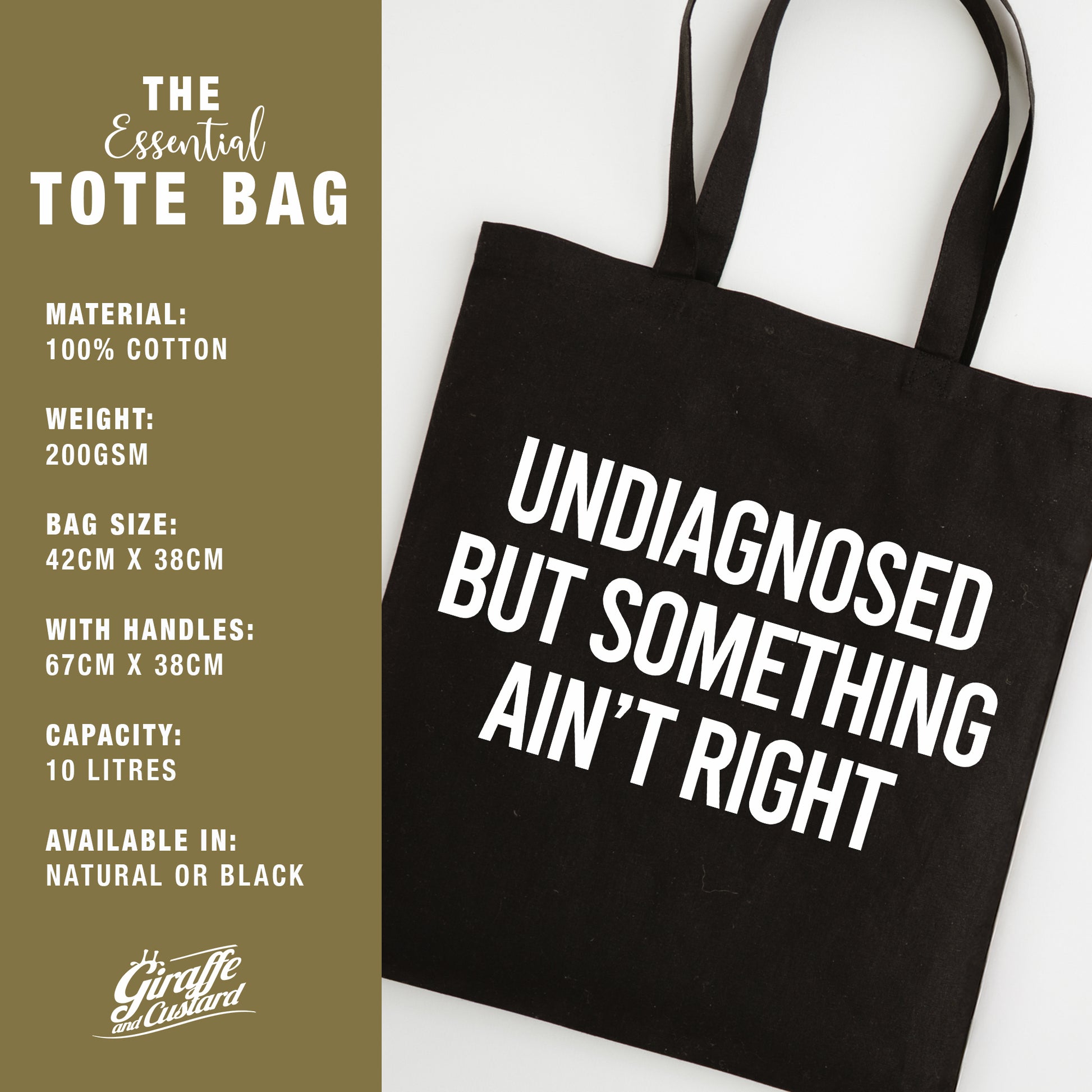 Make shopping more entertaining with this funny slogan tote bag featuring the quote “Undiagnosed but Something Ain't Right” Designed for shoppers with a sense of humour, this reusable tote is perfect for grocery runs, market trips, or casual everyday use.