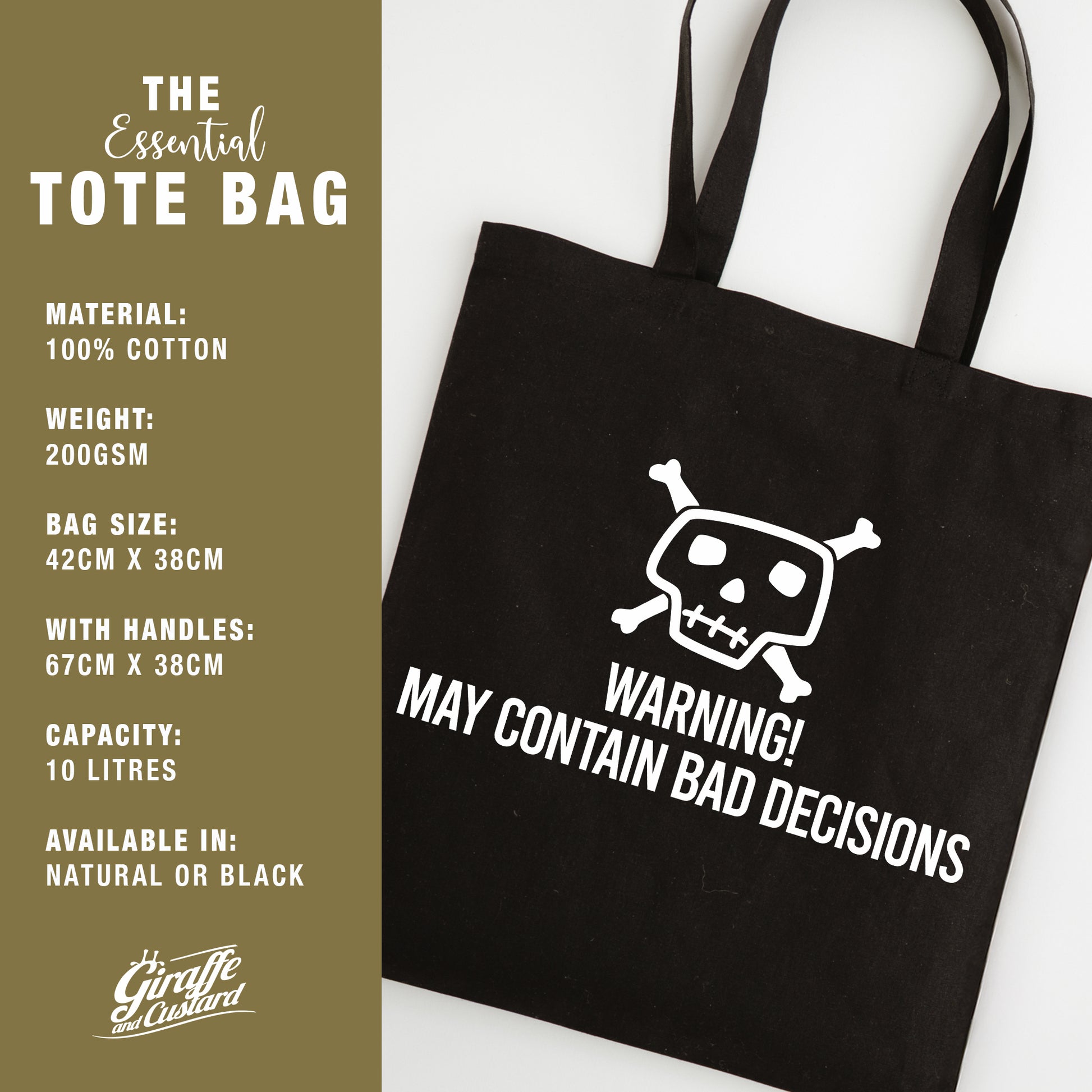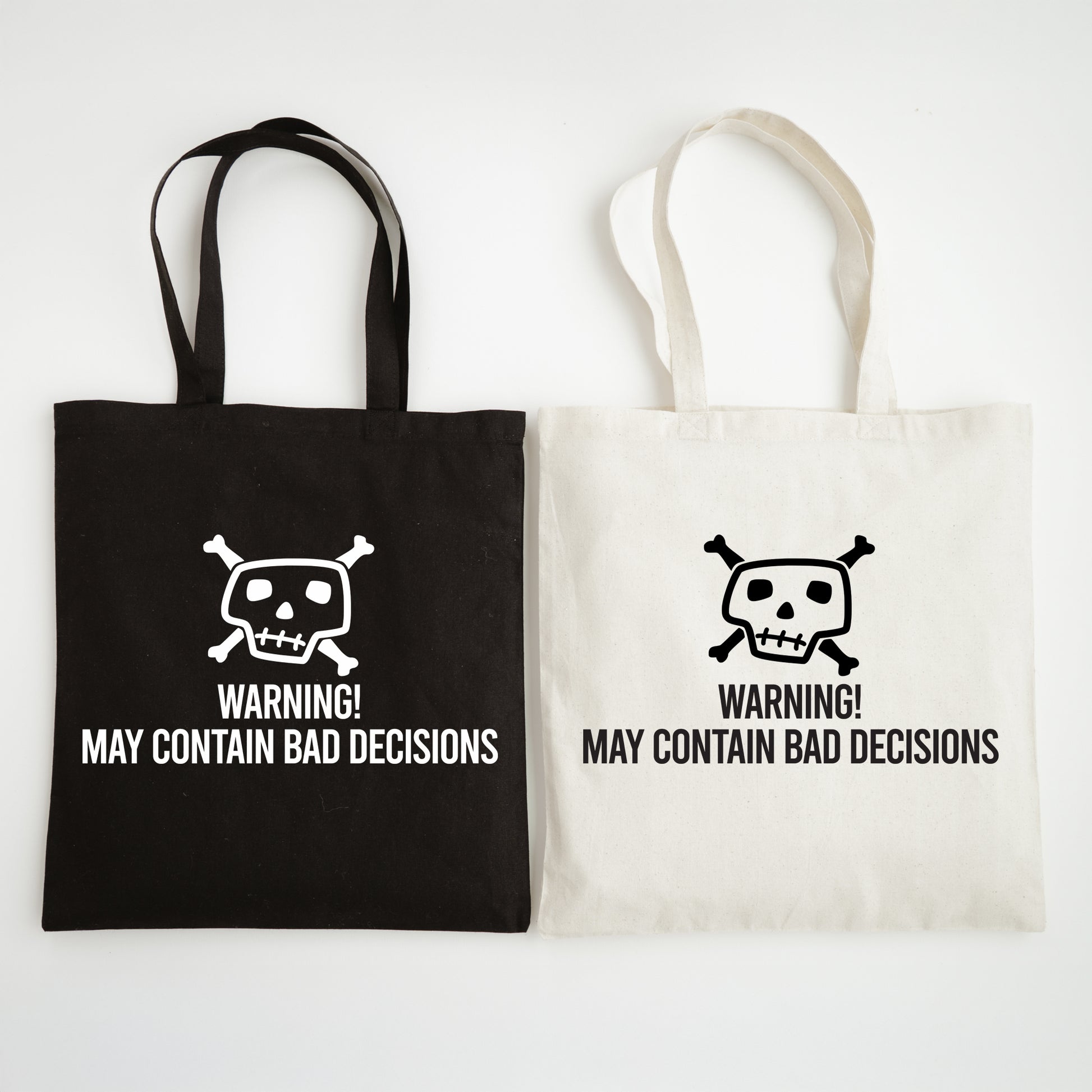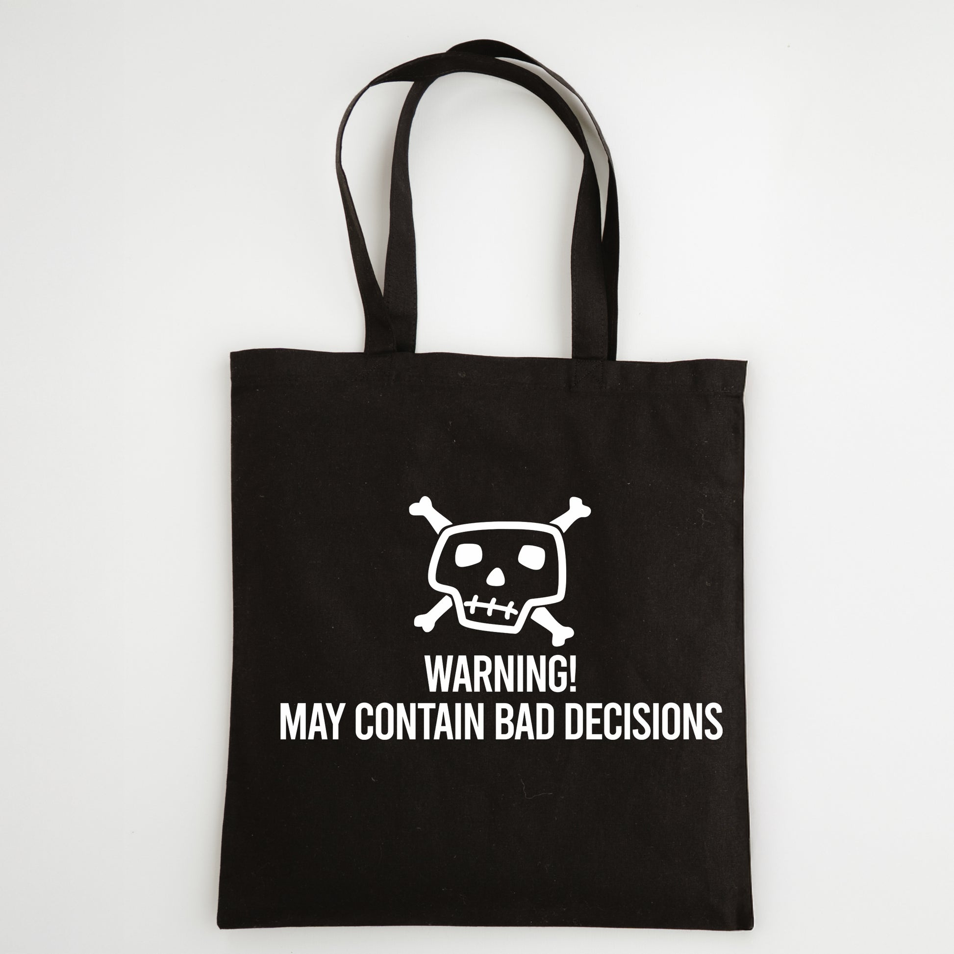 Make shopping more entertaining with this funny slogan tote bag featuring the quote “Warning - May Contain Bad Decisions” Designed for shoppers with a sense of humour, this reusable tote is perfect for grocery runs, market trips, or casual everyday use.