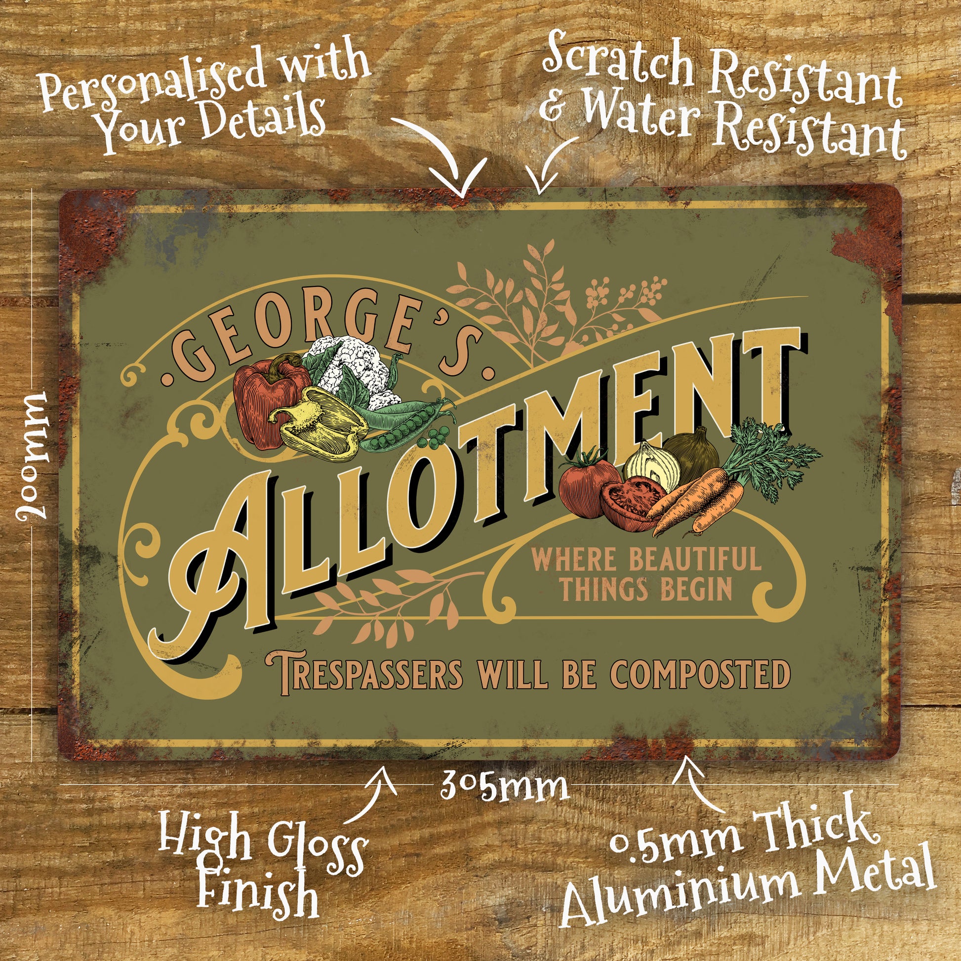 This Vintage style metal personalised Allotment sign is a great addition to any Allotment, Potting Shed, Greenhouse or Vegetable Patch. The sign is made from aluminium metal and is printed using dye sublimation inks which makes it completely waterproof. Personalise the sign your choice of Family name or a person's first name.